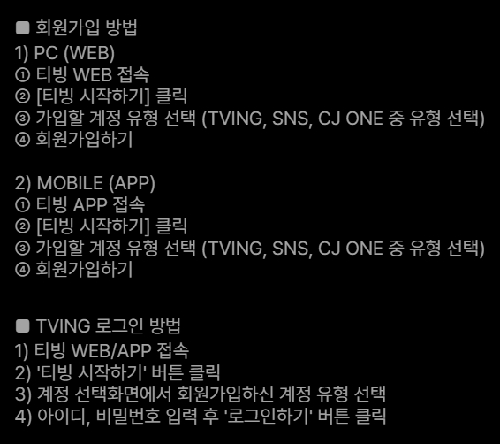 다만 2025년 4월 2일부터 시행되는 계정 공유 정책에 따라 회원(가입자)과 함께 거주하는 동일가구 구성원에 한하여 회원의 계정으로 티빙 서비스 이용이 허용됩니다. 만약, 가구 구성원이 아닌 경우에는 본인 계정으로 가입하여 이용해야 합니다.