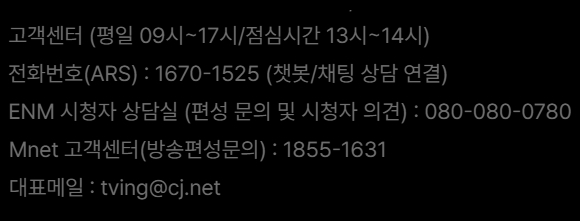 티빙 고객센터 전화번호는 1670-1525번, ENM 시청자 상담실 전화번호는 080-080-0780번, 엠넷 고객센터 전화번호는 1855-1631번, 대표메일은 tving@cj.net입니다. 고객센터 운영시간은 평일 09시부터 17시까지이고, 점심시간은 13시부터 14시까지입니다.
